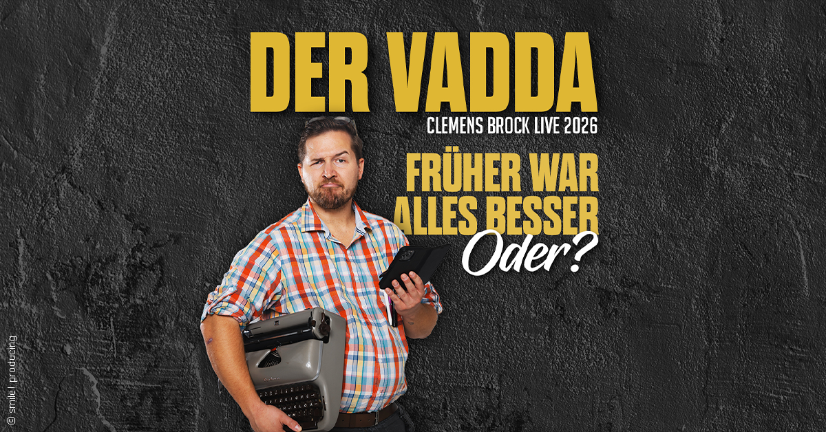 Eine humorvolle Abrechnung mit der „guten alten Zeit“ Lust auf einen Trip in die Vergangenheit, der dich laut lachen lässt? Dann sei dabei, wenn Clemens Brock alias „Der Vadda“ die Bühne rockt! In seiner neuen Live-Show „Früher war alles besser, oder?“ nimmt dich der sympathische Familienvater, der auf Social Media längst Kultstatus genießt, mit auf eine urkomische Zeitreise: Von Schreibmaschinen über VHS-Kassetten bis hin zu TikTok und Elternwahnsinn im Jahr 2026.