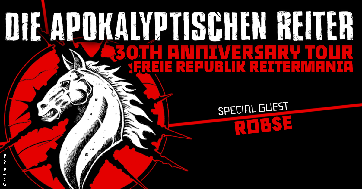 Nun bringen die Reiter dieses Feuer endlich wieder auf die Bühne! Die große 30 JAHRE ANNIVERSARY TOUR führt durch Deutschland, Österreich und die Schweiz – eine Reise, die Fans und Band gemeinsam in der grenzenlosen Republik Reitermania vereint. Mit einer mitreißenden Setlist, die Klassiker, Kultsongs und neue Hymnen vereint, versprechen Die Apokalyptischen Reiter eine Show, die Generationen verbindet – alte Weggefährten und neue Anhänger gleichermaßen. Magische Momente, bei denen Fans in Erinnerungen schwelgen und Neuentdecker die ungebändigte Energie der Reiter zum ersten Mal hautnah spüren. Vergangenheit und Zukunft verschmelzen in einer Show voller Leidenschaft, Musik und Reitermania! Als Direct Support kommen die Pagan Metaller Robse mit auf Tour, deren Fronter bereits in seinen Tagen bei Equilibrium mit den Reitern auf Tour war und nun eine neue Band formiert hat.